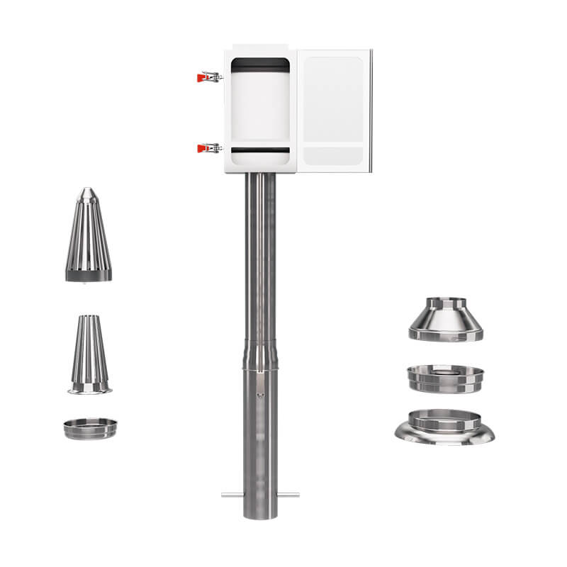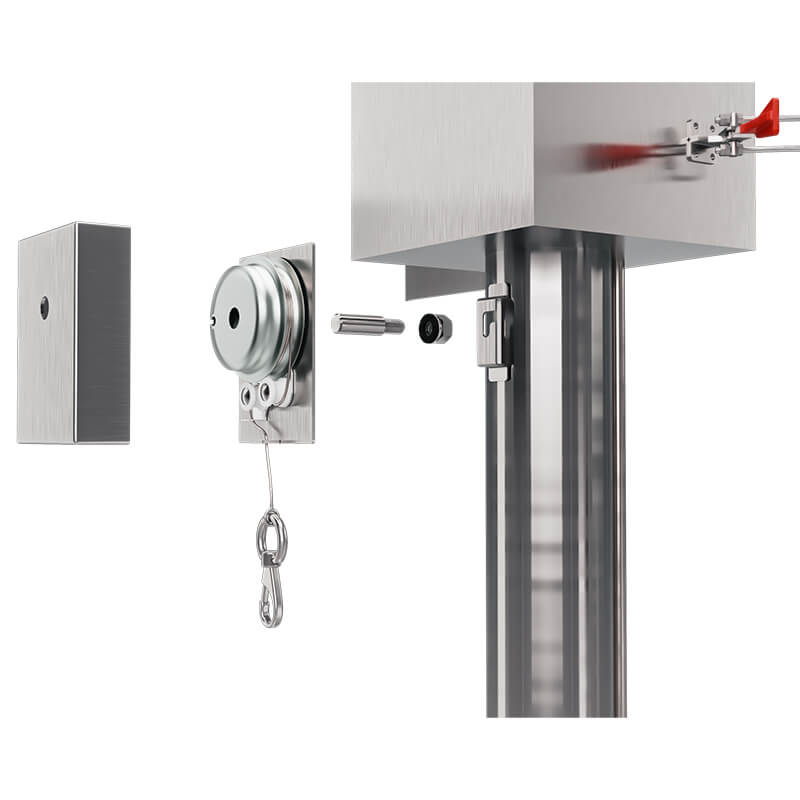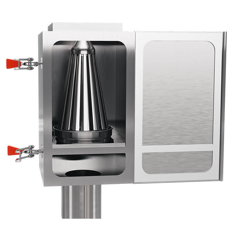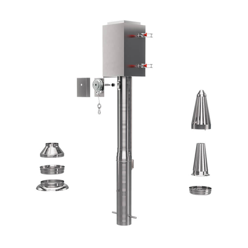 Features a square filter box for stable airflow and easy fire system setup, a ball bearing coupling for quick pipe detachment, a safe stainless handle, and smooth motion via spring balancer.